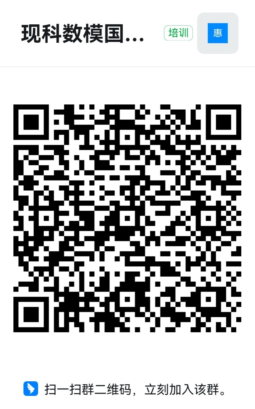 4. 报名方法: 扫描下面二维码,实名申请(专业+班级+姓名)加入“现科数模国赛群2023”,填写群文件“2023年现科数模国赛暑假集训及参赛报名表”。