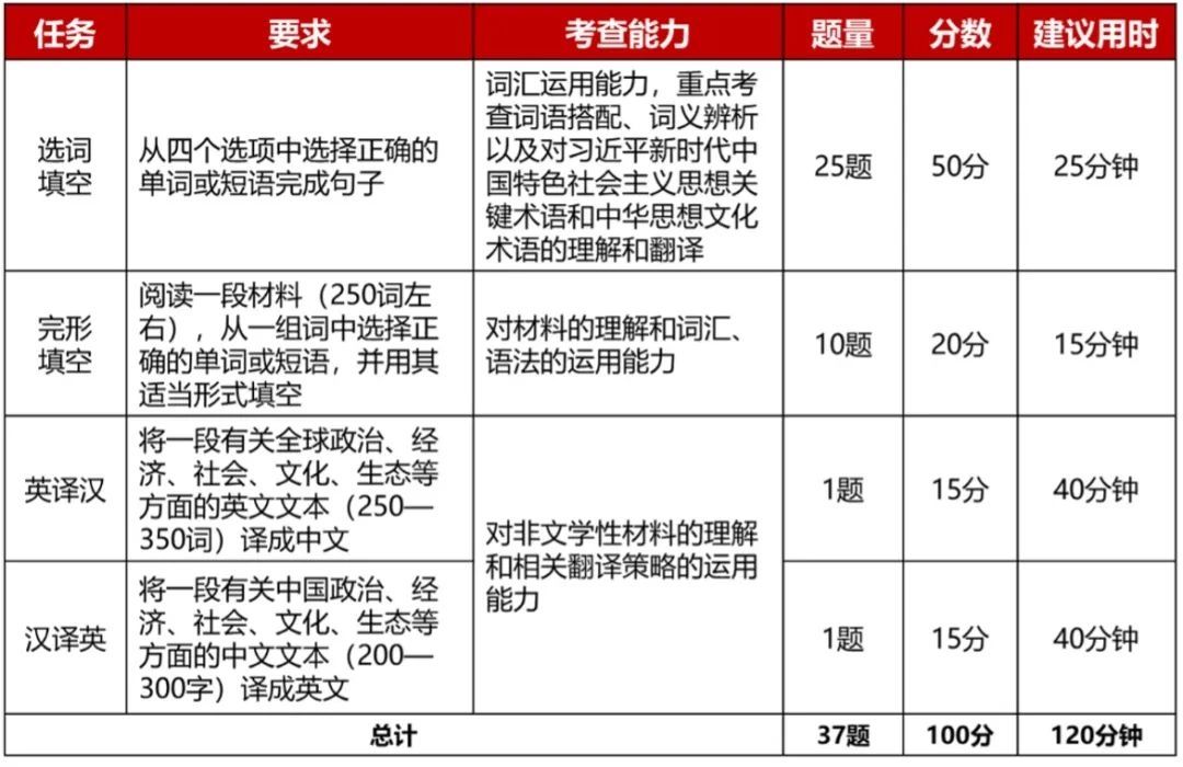 英语组题目类型、难度、测试系统均与2025“外研社·国才杯”“理解当代中国”全国大学生外语能力大赛英语组综合能力、笔译校赛要求一致,具体如下所示。