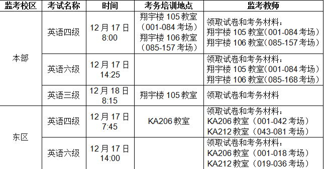 二、请各学院、相关部门务必通知监考教师准时参加考务培训会。考务培训会及领卷安排如下: